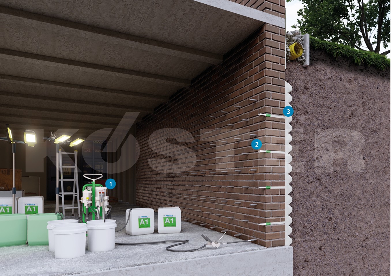 У таких випадках можливими є внутрішні ін’єкції для утворення зовнішнього гідроізоляційного захист з матеріалом KÖSTER Injection Gel G4, коли смола ін’єктується крізь стіну зсередини назовні. Смола вступає в реакцію з водою і зв’язує її, утворюючи водонепроникне пружне тверде тіло. Ін’єкції виконуються за допомогою спеціальної помпи і через запатентовані KÖSTER Leitlanzen (KÖSTER Distributor Lances). Ін’єкційний матеріал розподіляється на зовнішній стіні і за короткий час вступає в реакцію з шаром гідроізоляції. Альтернативним методом є ін’єктування матеріалу KÖSTER Injection Gel G4 в саму частину будівлі. Ця так звана «поверхнева ін’єкція» є можливою для пористих або пустотілих будівельних матеріалів. У цьому випадку KÖSTER Injection Gel G4 також вступає в реакцію з водою для формування водонепроникного пружного твердого тіла.