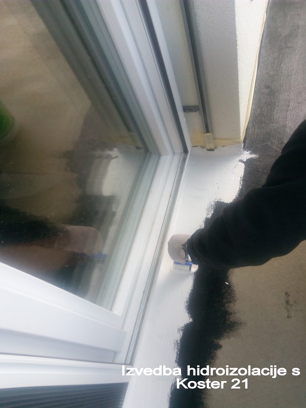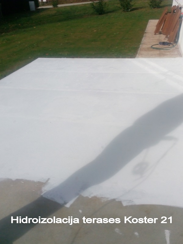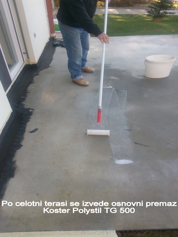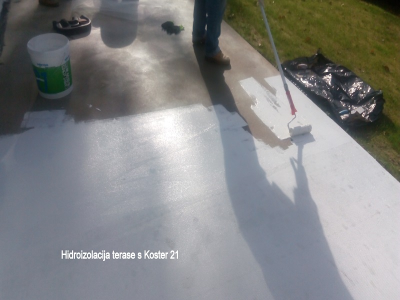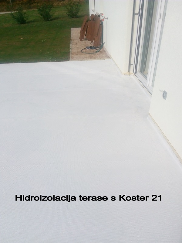 Dobro izvedena hidroizolacija terase prepreči vlaženje zidov in s tem povezane poškodbe objekta. Zelo pomembna je pravilna in dosledna izvedba detajla - stika terase in zidu. Kvaliteten stik lahko izvedemo z uporabo pravih materialov, ki imajo lahko obdelavnost, enostavno uporabo, dober oprijem, veliko razteznost, enostavno čiščenje orodja in dolgo življenjsko dobo ne glede na zunanje vplive. Priprava podlage celotne površine betonske terase. Tesnjenje stikov med hišo in teraso, s Köster KBE Tekočo folijo, v sveži prvi nanos je bila vgrajena armirna mrežica. Izdelava tesnilnega sistema s Köster 21. Pred nanosom Köster 21 se je na celotno površino nanesel osnovni premaz Polysil TG 500, kateri dodatno utrdi podlago, zmanjša volumen ter prepreči nastajanje in izločanje solitra. V sveži prvi nanos Köster 21 je bila vgrajena Köster Armirna mrežica.