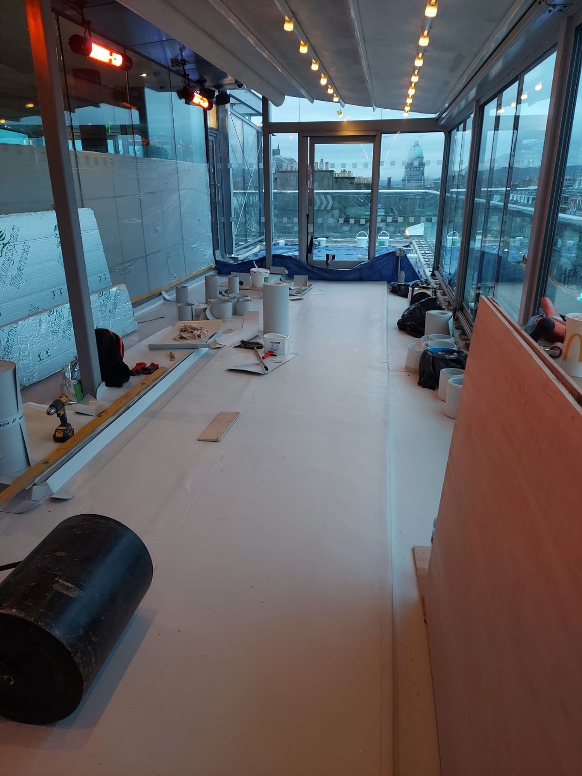 Because of the warm roof design, we were able to incorporate the KÖSTER Vapour Barrier FR bonded directly to the screed to falls. This fully adhered vapour barrier also serves as a temporary watertight layer, this allowed us to keep the rooms below waterproof through the various stages of the build - even though waterproofing had been removed.