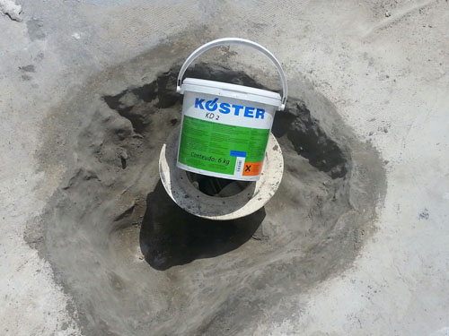 Flowing water stopped with KÖSTER KD 2 Blitz Powder. Swimming pool is waterproofed with KÖSTER 21 and ceramic on top.